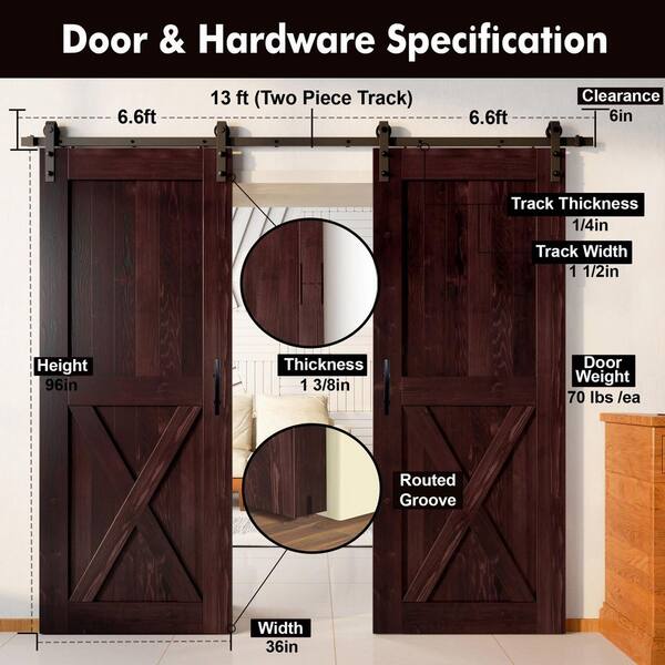 36 in. x 96 in. X-Frame Red Mahogany Double Pine Wood Interior Sliding Barn Door with Hardware Kit, Non-Bypass