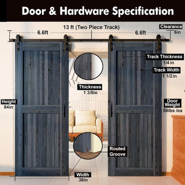 38 in. x 84 in. H-Frame Navy Double Pine Wood Interior Sliding Barn Door with Hardware Kit, Non-Bypass