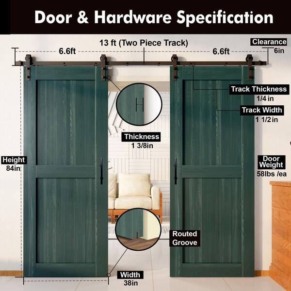 38 in. x 84 in. H-Frame Royal Pine Double Pine Wood Interior Sliding Barn Door with Hardware Kit, Non-Bypass