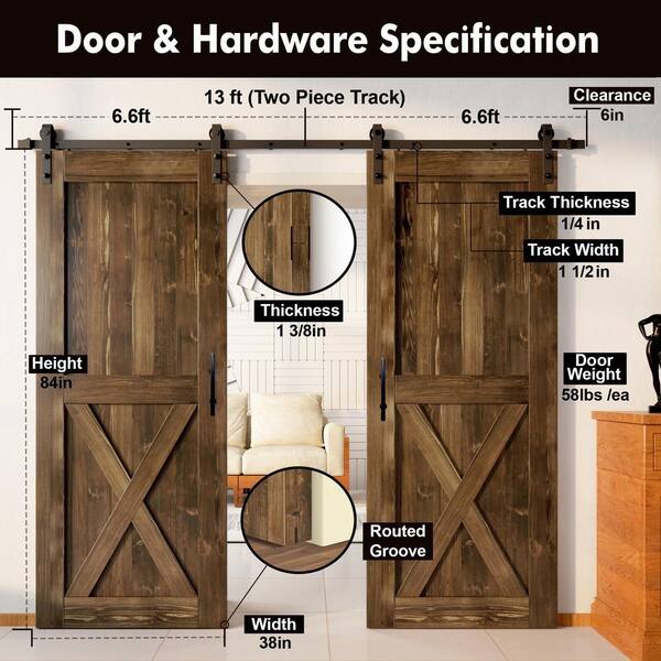 38 in. x 84 in. X-Frame Walnut Double Pine Wood Interior Sliding Barn Door with Hardware Kit, Non-Bypass