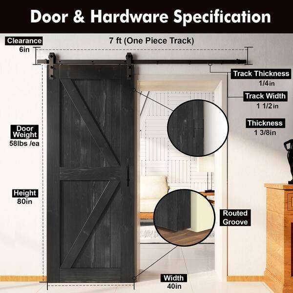 40 in. x 80 in. 5-in-1 Design Black Solid Pine Wood Interior Sliding Barn Door with Hardware Kit, Non-Bypass