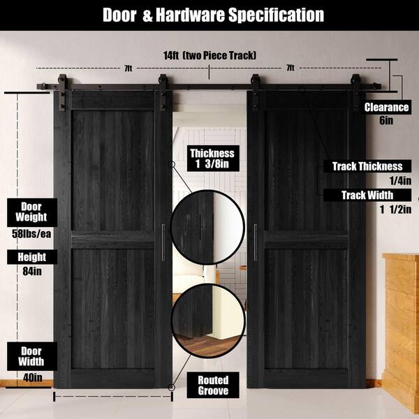 40 in. x 84 in. H-Frame Black Double Pine Wood Interior Sliding Barn Door with Hardware Kit, Non-Bypass