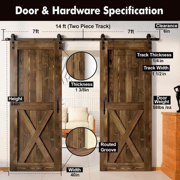 40 in. x 84 in. X-Frame Walnut Double Pine Wood Interior Sliding Barn Door with Hardware Kit, Non-Bypass