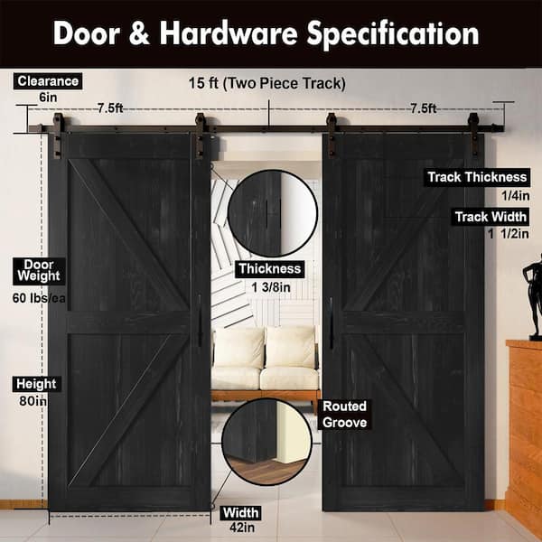 42 in. x 80 in. 5-in-1 Design Black Double Pine Wood Interior Sliding Barn Door with Hardware Kit, Non-Bypass