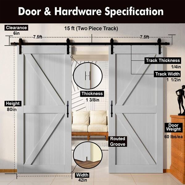 42 in. x 80 in. 5-in-1 Design White Double Pine Wood Interior Sliding Barn Door with Hardware Kit, Non-Bypass