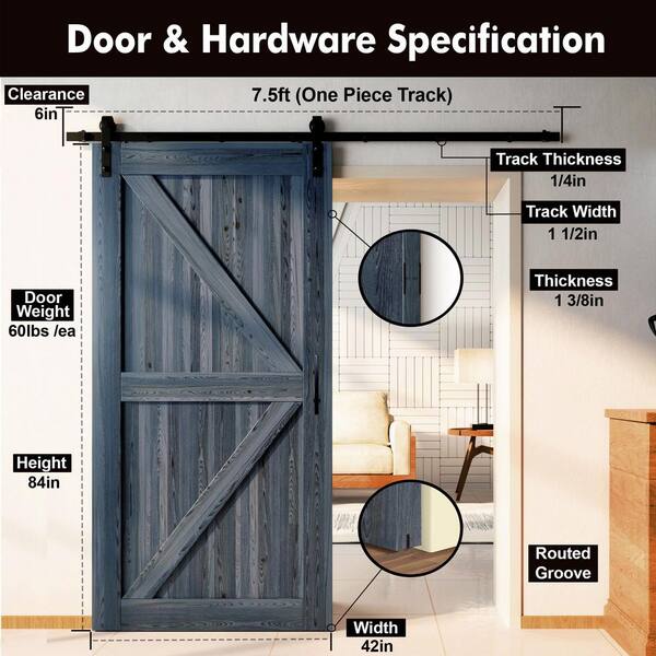 42 in. x 84 in. K-Frame Navy Solid Pine Wood Interior Sliding Barn Door with Hardware Kit, Non-Bypass