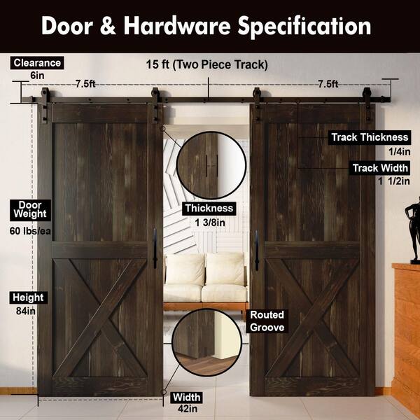 42 in. x 84 in. X-Frame Ebony Double Pine Wood Interior Sliding Barn Door with Hardware Kit, Non-Bypass