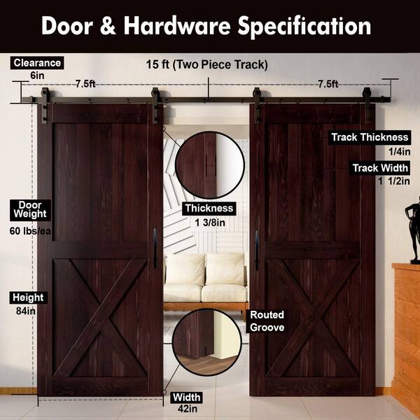 42 in. x 84 in. X-Frame Red Mahogany Double Pine Wood Interior Sliding Barn Door with Hardware Kit, Non-Bypass