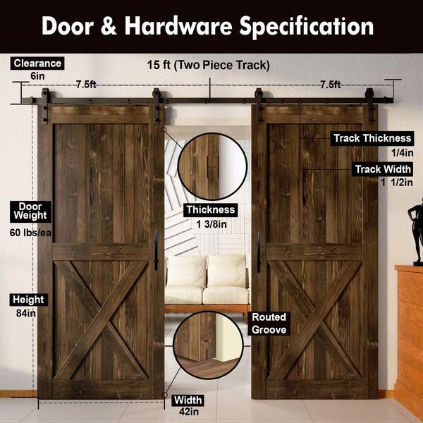 42 in. x 84 in. X-Frame Walnut Double Pine Wood Interior Sliding Barn Door with Hardware Kit, Non-Bypass