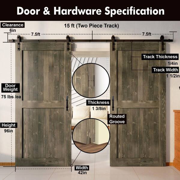 42 in. x 96 in. H-Frame Classic Gray Double Pine Wood Interior Sliding Barn Door with Hardware Kit, Non-Bypass