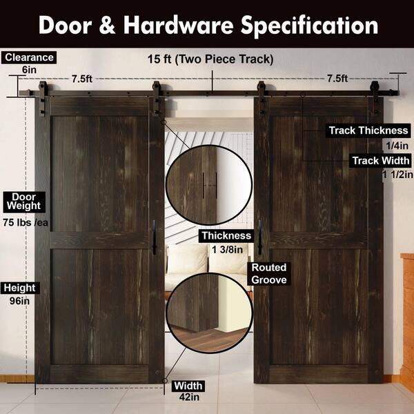 42 in. x 96 in. H-Frame Ebony Double Pine Wood Interior Sliding Barn Door with Hardware Kit, Non-Bypass