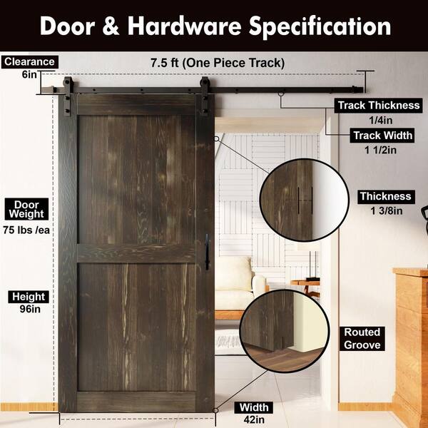 42 in. x 96 in. H-Frame Ebony Solid Pine Wood Interior Sliding Barn Door with Hardware Kit, Non-Bypass