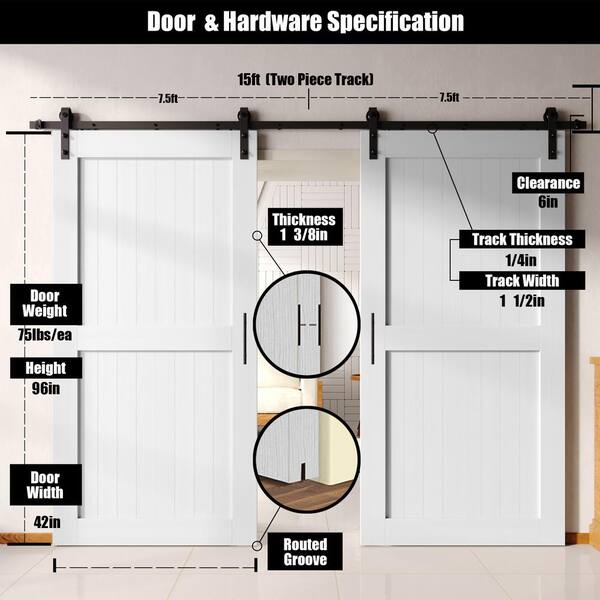 42 in. x 96 in. H-Frame White Double Pine Wood Interior Sliding Barn Door with Hardware Kit, Non-Bypass