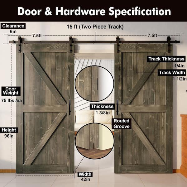 42 in. x 96 in. K-Frame Classic Gray Double Pine Wood Interior Sliding Barn Door with Hardware Kit, Non-Bypass