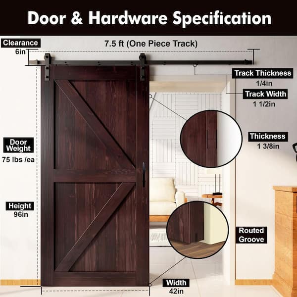42 in. x 96 in. K-Frame Red Mahogany Solid Pine Wood Interior Sliding Barn Door with Hardware Kit, Non-Bypass
