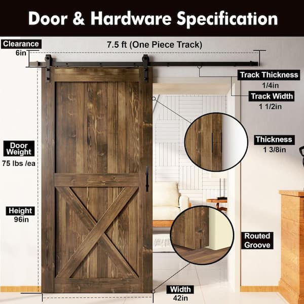 42 in. x 96 in. X-Frame Walnut Solid Pine Wood Interior Sliding Barn Door with Hardware Kit, Non-Bypass
