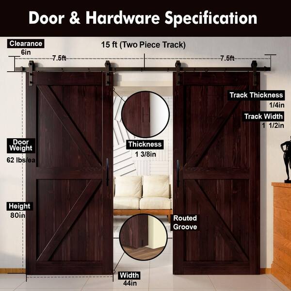 44 in. x 80 in. 5-in-1 Design Red Mahogany Double Pine Wood Interior Sliding Barn Door with Hardware Kit, Non-Bypass