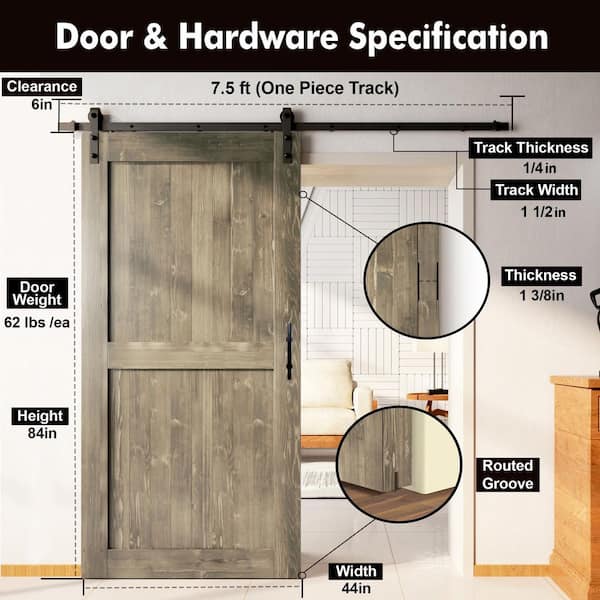44 in. x 84 in. H-Frame Classic Gray Solid Pine Wood Interior Sliding Barn Door with Hardware Kit Non-Bypass