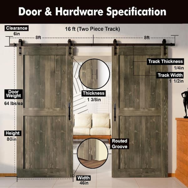 46 in. x 80 in. 5-in-1 Design Classic Gray Double Pine Wood Interior Sliding Barn Door with Hardware Kit, Non-Bypass