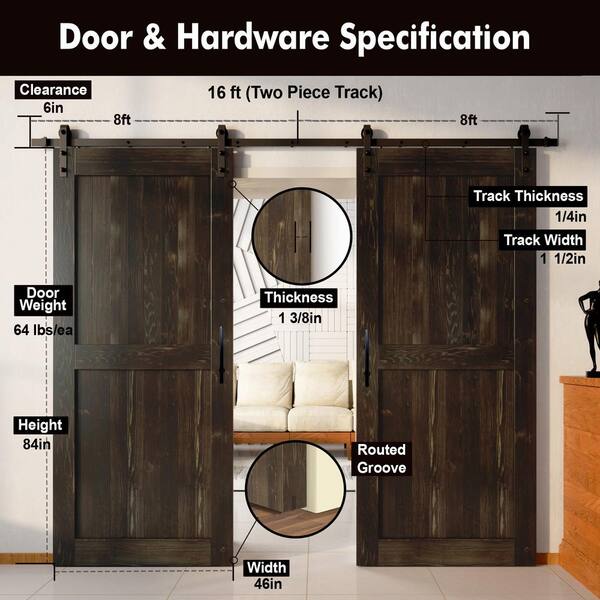 46 in. x 84 in. H-Frame Ebony Double Pine Wood Interior Sliding Barn Door with Hardware Kit, Non-Bypass