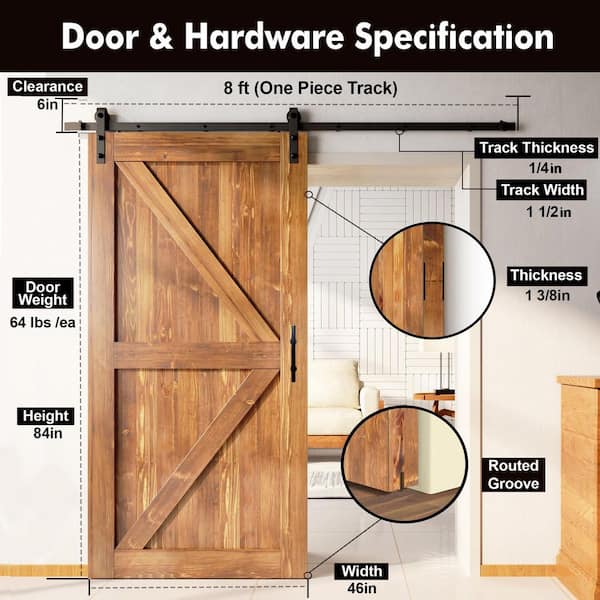 46 in. x 84 in. K-Frame Early American Solid Pine Wood Interior Sliding Barn Door with Hardware Kit, Non-Bypass