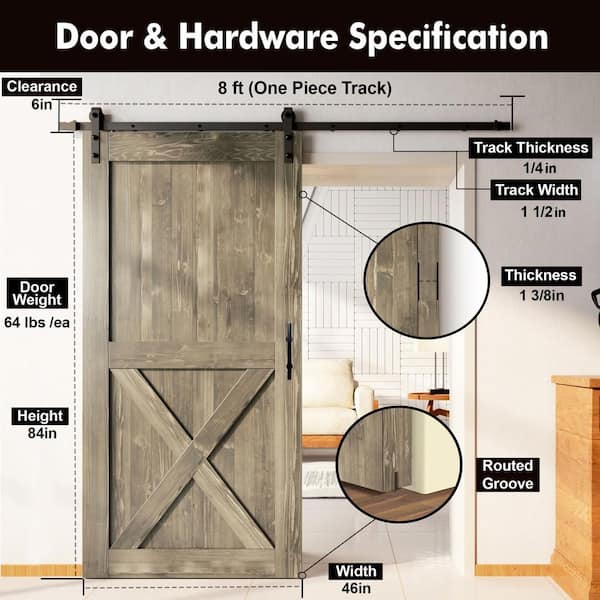 46 in. x 84 in. X-Frame Classic Gray Solid Pine Wood Interior Sliding Barn Door with Hardware Kit, Non-Bypass
