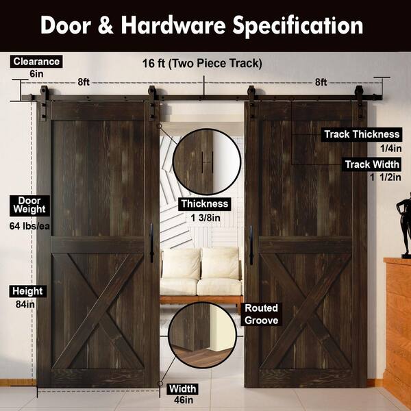 46 in. x 84 in. X-Frame Ebony Double Pine Wood Interior Sliding Barn Door with Hardware Kit, Non-Bypass