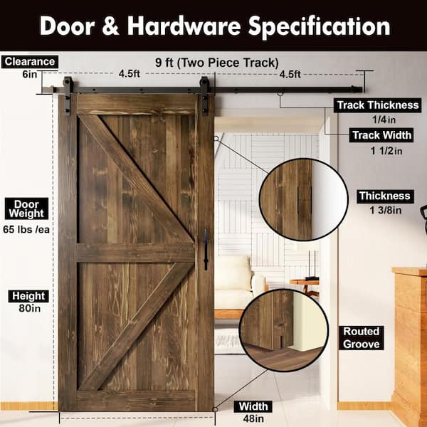 48 in. x 80 in. 5-in-1 Design Walnut Solid Pine Wood Interior Sliding Barn Door with Hardware Kit, Non-Bypass
