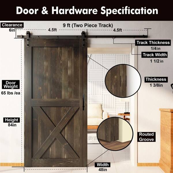 48 in. x 84 in. X-Frame Ebony Solid Pine Wood Interior Sliding Barn Door with Hardware Kit, Non-Bypass