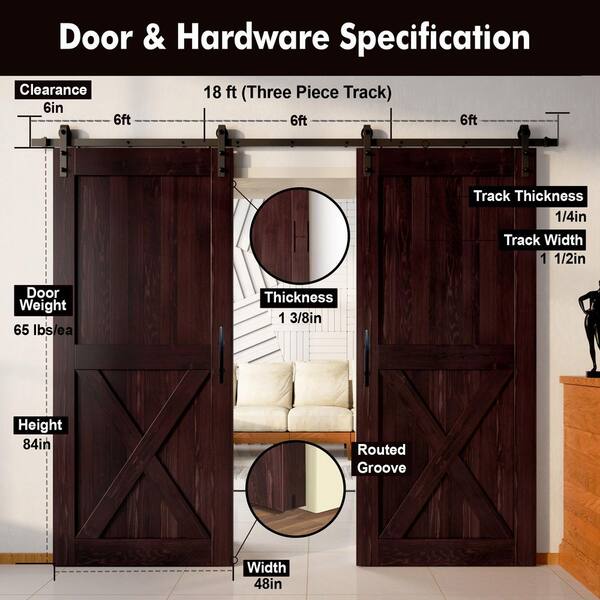 48 in. x 84 in. X-Frame Red Mahogany Double Pine Wood Interior Sliding Barn Door with Hardware Kit, Non-Bypass