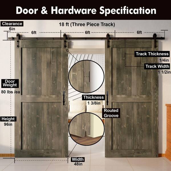 48 in. x 96 in. H-Frame Classic Gray Double Pine Wood Interior Sliding Barn Door with Hardware Kit, Non-Bypass