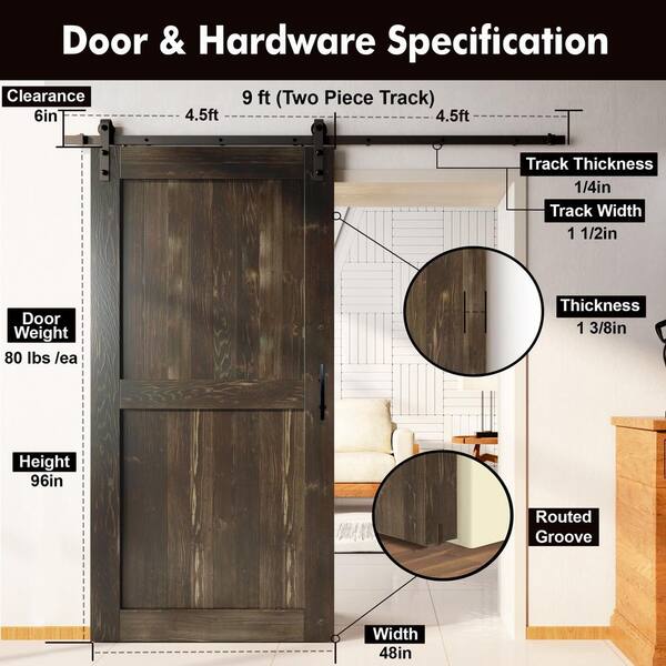 48 in. x 96 in. H-Frame Ebony Solid Pine Wood Interior Sliding Barn Door with Hardware Kit, Non-Bypass