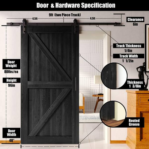 48 in. x 96 in. K-Frame Black Solid Pine Wood Interior Sliding Barn Door with Hardware Kit, Non-Bypass