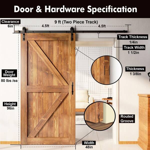 48 in. x 96 in. K-Frame Early American Solid Pine Wood Interior Sliding Barn Door with Hardware Kit, Non-Bypass