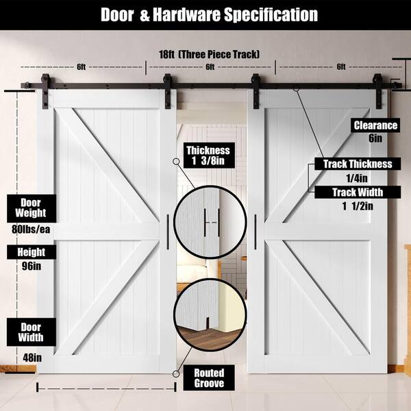 48 in. x 96 in. K-Frame White Double Pine Wood Interior Sliding Barn Door with Hardware Kit, Non-Bypass