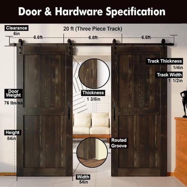 54 in. x 84 in. H-Frame Ebony Double Pine Wood Interior Sliding Barn Door with Hardware Kit, Non-Bypass