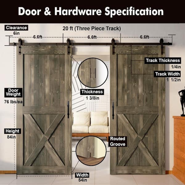 54 in. x 84 in. X-Frame Classic Gray Double Pine Wood Interior Sliding Barn Door with Hardware Kit, Non-Bypass