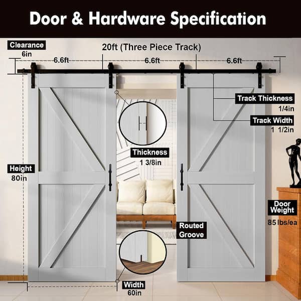 60 in. x 80 in. 5-in-1 Design White Double Pine Wood Interior Sliding Barn Door with Hardware Kit, Non-Bypass