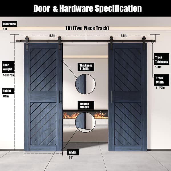 XT1 30 in. x 84 in. C-Panel Navy Slanted Stripe Design Double Pine Wood Sliding Barn Door with Hardware Kit