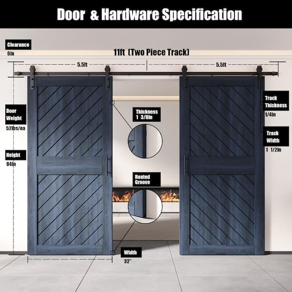 XT1 32 in. x 84 in. C-Panel Navy Slanted Stripe Design Double Pine Wood Sliding Barn Door with Hardware Kit