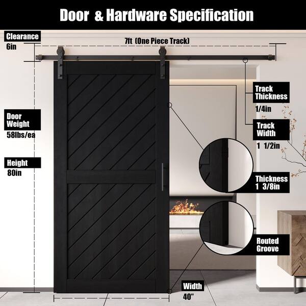 XT1 40 in. x 80 in. C-Panel Black Slanted Stripe Design Solid Pine Wood Sliding Barn Door with Hardware Kit