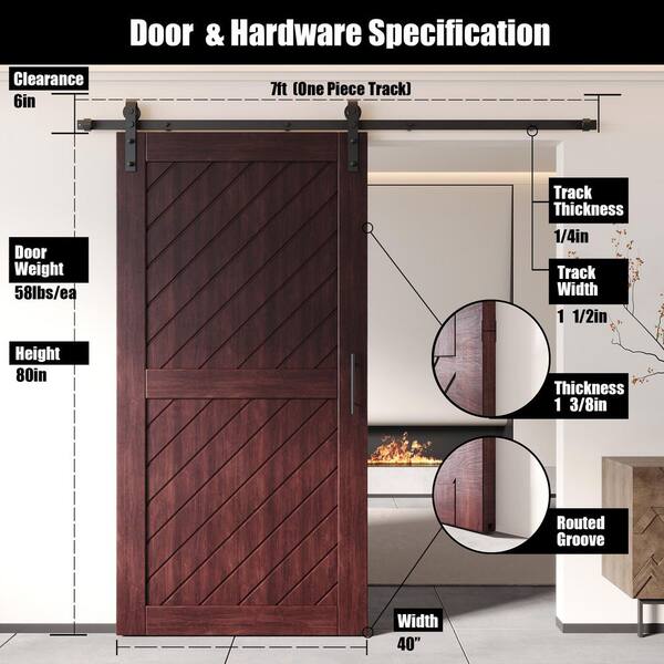 XT1 40 in. x 80 in. C-Panel Red Mahogany Slanted Stripe Design Solid Pine Wood Sliding Barn Door with Hardware Kit