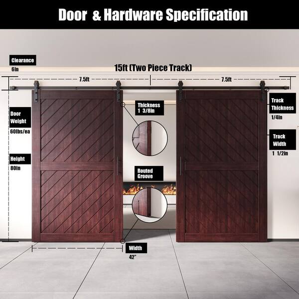 XT1 42 in. x 80 in. C-Panel Red Mahogany Slanted Stripe Design Double Pine Wood Sliding Barn Door with Hardware Kit