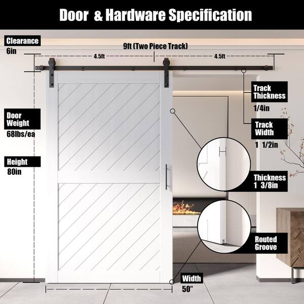 XT1 50 in. x 80 in. C-Panel White Slanted Stripe Design Solid Pine Wood Sliding Barn Door with Hardware Kit