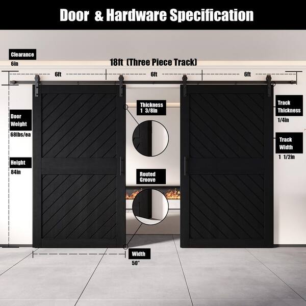 XT1 50 in. x 84 in. C-Panel Black Slanted Stripe Design Double Pine Wood Sliding Barn Door with Hardware Kit
