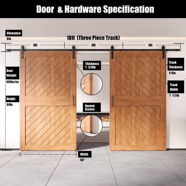 XT1 50 in. x 84 in. C-Panel Early American Slanted Stripe Design Double Pine Wood Sliding Barn Door with Hardware Kit