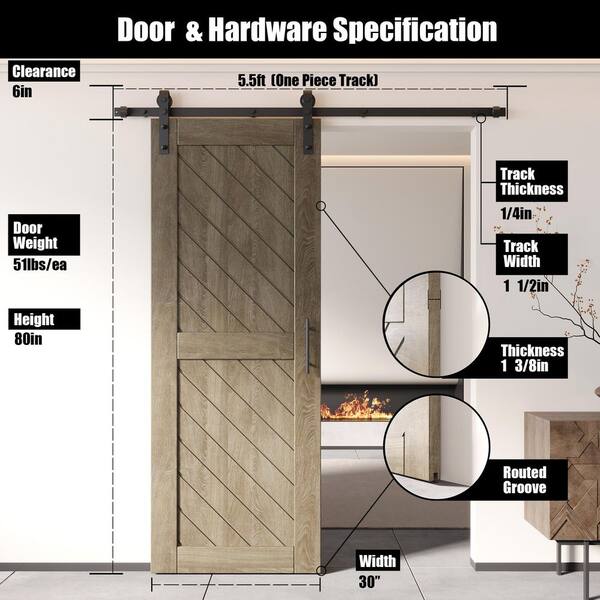XT2 30 in. x 80 in. C-Panel Classic Gray Slanted Stripe Design Solid Pine Wood Sliding Barn Door with Hardware Kit