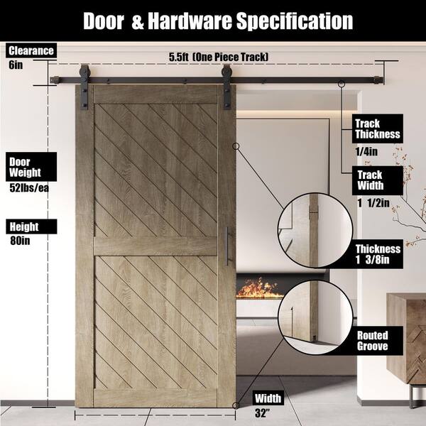XT2 32 in. x 80 in. C-Panel Classic Gray Slanted Stripe Design Solid Pine Wood Sliding Barn Door with Hardware Kit