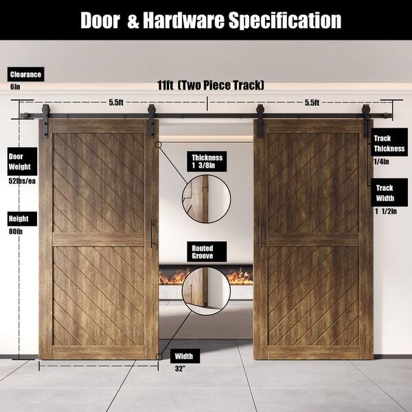 XT2 32 in. x 80 in. C-Panel Dark Walnut Slanted Stripe Design Double Pine Wood Sliding Barn Door with Hardware Kit
