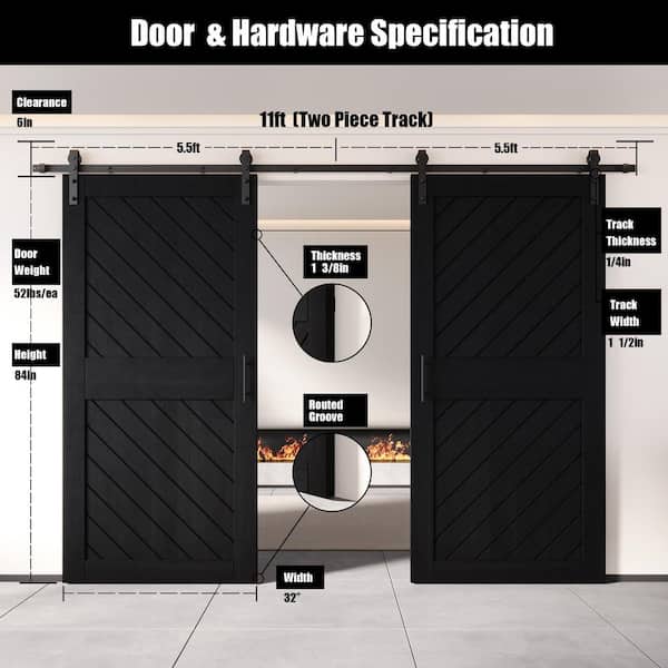 XT2 32 in. x 84 in. C-Panel Black Slanted Stripe Design Double Pine Wood Sliding Barn Door with Hardware Kit
